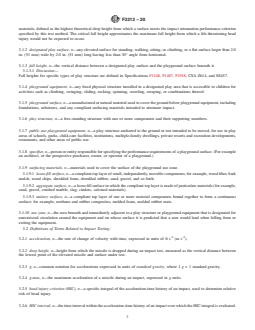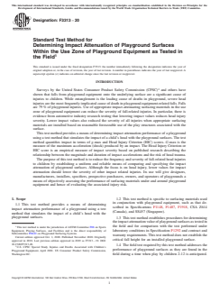 ASTM F3313-20 is a standard published by ASTM International. Its full title is "Standard Test Method for Determining Impact Attenuation of Playground Surfaces Within the Use Zone of Playground Equipment as Tested in the Field". This standard covers: SIGNIFICANCE AND USE 6.1 The purpose of this test method is to establish impact attenuation for the installed playground surface at the time of testing. 6.2 This test method provides a uniform means of quantifying the impact attenuation performance of installed playground surfaces. 6.3 This test method is to be used as a reference for specifying the impact attenuation performance of an installed playground surface. 6.4 This test method provides a uniform means of comparing the impact attenuation performance of installed playground surfaces with the performance requirements of this test method and with other performance requirements expressed in terms of drop height. Consequently, the test method is appropriately used to determine the actual impact attenuation performance of installed playground surfaces under ambient conditions of use. 6.5 In combination with data relating impact test scores to head injury, the information generated by application of this test method is suitable to estimate the relative risk of a severe head injury due to a fall. 6.6 Performance of this test does not satisfy the requirements to certify surfaces to the specification Specification F1292. SCOPE 1.1 This test method provides a means of determining impact attenuation performance of a playground using a test method that simulates the impact of a child's head with the playground surfaces. 1.2 This test method is specific to surfacing materials used in conjunction with playground equipment, such as that described in Specifications F1148, F1487, F1918, CSA Z614 (Canada), and SS457 (Singapore). 1.3 This test method establishes procedures for determining the impact attenuation value of playground surfaces as tested in the field and for comparison with the test performed under laboratory conditions in Specification F1292 and contract and warranty requirements. This test method does not establish the critical fall height for an installed playground surface. 1.4 The field test required by this test method addresses the performance of playground surfaces as they are found in the field during a time when play by children 2-12 is anticipated. 1.5 The impact attenuation test method and test methods established in this test method are specific to the risk of head injury. There is evidence that lowering impact attenuation values can reduce the risk of other kinds of serious injury (for example, long bone fractures). 1.6 This test method relates only to the impact attenuation properties of playground surfacing materials and does not address other factors that contribute to fall-related injuries. While it is believed that conformance with the requirements of this test method will reduce the risk of severe injury and death from falls, adherence to this test method will not prevent all injuries and deaths. 1.7 The values stated in inch-pound units are to be regarded as standard. The values given in parentheses are mathematical conversions to SI units that are provided for information only and are not considered standard. 1.8 This standard does not purport to address all of the safety concerns, if any, associated with its use. It is the responsibility of the user of this standard to establish appropriate safety, health, and environmental practices and determine the applicability of regulatory limitations prior to use. 1.9 This international standard was developed in accordance with internationally recognized principles on standardization established in the Decision on Principles for the Development of International Standards, Guides and Recommendations issued by the World Trade Organization Technical Barriers to Trade (TBT) Committee.