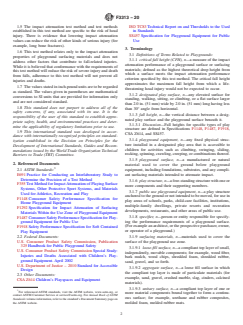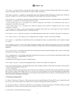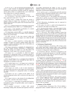 The standard describes field procedures to determine the ability of playground surfacing materials-such as loose-fill or unitary surfaces-to absorb and dissipate impact energy from a fall. - Performance Parameters