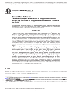 SIGNIFICANCE AND USE 6.1 The purpose of this test method is to establish impact attenuation for the installed playground surface at the time of testing. 6.2 This test method provides a uniform means of quantifying the impact attenuation performance of installed playground surfaces. 6.3 This test method is to be used as a reference for specifying the impact attenuation performance of an installed playground surface. 6.4 This test method provides a uniform means of comparing the impact attenuation performance of installed playground surfaces with the performance requirements of this test method and with other performance requirements expressed in terms of drop height. Consequently, the test method is appropriately used to determine the actual impact attenuation performance of installed playground surfaces under ambient conditions of use. 6.5 In combination with data relating impact test scores to head injury, the information generated by application of this test method is suitable to estimate the relative risk of a severe head injury due to a fall. 6.6 Performance of this test does not satisfy the requirements to certify surfaces to the specification Specification F1292. SCOPE 1.1 This test method provides a means of determining impact attenuation performance of a playground using a test method that simulates the impact of a child's head with the playground surfaces. 1.2 This test method is specific to surfacing materials used in conjunction with playground equipment, such as that described in Specifications F1148, F1487, F1918, CSA Z614 (Canada), and SS457 (Singapore). 1.3 This test method establishes procedures for determining the impact attenuation value of playground surfaces as tested in the field and for comparison with the test performed under laboratory conditions in Specification F1292 and contract and warranty requirements. This test method does not establish the critical fall height for an installed playground surface. 1.4 The field test required by this test method addresses the performance of playground surfaces as they are found in the field during a time when play by children 2-12 is anticipated. 1.5 The impact attenuation test method and test methods established in this test method are specific to the risk of head injury. There is evidence that lowering impact attenuation values can reduce the risk of other kinds of serious injury (for example, long bone fractures). 1.6 This test method relates only to the impact attenuation properties of playground surfacing materials and does not address other factors that contribute to fall-related injuries. While it is believed that conformance with the requirements of this test method will reduce the risk of severe injury and death from falls, adherence to this test method will not prevent all injuries and deaths. 1.7 The values stated in inch-pound units are to be regarded as standard. The values given in parentheses are mathematical conversions to SI units that are provided for information only and are not considered standard. 1.8 This standard does not purport to address all of the safety concerns, if any, associated with its use. It is the responsibility of the user of this standard to establish appropriate safety, health, and environmental practices and determine the applicability of regulatory limitations prior to use. 1.9 This international standard was developed in accordance with internationally recognized principles on standardization established in the Decision on Principles for the Development of International Standards, Guides and Recommendations issued by the World Trade Organization Technical Barriers to Trade (TBT) Committee.