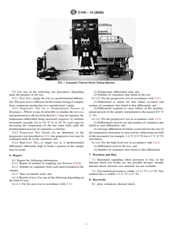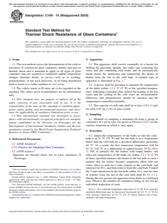 ASTM C149-14(2020) is a standard published by ASTM International. Its full title is "Standard Test Method for Thermal Shock Resistance of Glass Containers". This standard covers: ABSTRACT This test method covers the determination of the relative thermal shock resistance of commercial bottles and jars and is intended to apply to all types of glass containers that are required to withstand sudden changes in temperature in service. The test apparatus consists essentially of a basket for holding the glassware upright, a hot water tank, a cold water tank, and a timed means for immersing and transferring the basket from the hot to the cold bath. Indicating controllers or dial thermometers should be used to maintain the temperatures of the baths. Test procedures included in this specification include pass tests, progressive tests to a predetermined percent of breakage, total progressive tests, and high-level tests. SCOPE 1.1 This test method covers the determination of the relative resistance of commercial glass containers (bottles and jars) to thermal shock and is intended to apply to all types of glass containers that are required to withstand sudden temperature changes (thermal shock) in service such as in washing, pasteurization, or hot pack processes, or in being transferred from a warm to a colder medium or vice versa. 1.2 The values stated in SI units are to be regarded as the standard. The values given in parentheses are for information only. 1.3 This standard does not purport to address all of the safety concerns, if any, associated with its use. It is the responsibility of the user of this standard to establish appropriate safety, health, and environmental practices and determine the applicability of regulatory limitations prior to use. 1.4 This international standard was developed in accordance with internationally recognized principles on standardization established in the Decision on Principles for the Development of International Standards, Guides and Recommendations issued by the World Trade Organization Technical Barriers to Trade (TBT) Committee.