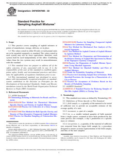 ASTM D979/D979M-22 is a standard published by ASTM International. Its full title is "Standard Practice for Sampling Asphalt Mixtures". This standard covers: SIGNIFICANCE AND USE 4.1 General: 4.1.1 Sampling is equally as important as the testing, and the sampler shall take every precaution to obtain samples that will yield an acceptable estimate of the nature and conditions of the materials which they represent. 4.1.2 Samples for the development of preliminary data are obtained by the party responsible for the development of the data. Samples for control of the product at the source of manufacture or storage, or at the site of use, are obtained by the manufacturer, contractor, or other parties responsible for accomplishing the work. Samples for tests to be used in acceptance or rejection decisions by the purchaser are obtained by the purchaser or his authorized representative. 4.1.3 This standard shall not be used for the sampling of compacted asphalt mixtures. Practice D5361/D5361M shall be used. SCOPE 1.1 This practice covers sampling of asphalt mixtures at points of manufacture, storage, delivery, or in place. 1.2 The values stated in either SI units or inch-pound units are to be regarded separately as standard. The values stated in each system may not be exact equivalents; therefore, each system shall be used independently of the other. Combining values from the two systems may result in nonconformance with the standard. 1.3 This standard does not purport to address all of the safety concerns, if any, associated with its use. It is the responsibility of the user of this standard to establish appropriate safety, health, and environmental practices and determine the applicability of regulatory limitations prior to use. 1.4 This international standard was developed in accordance with internationally recognized principles on standardization established in the Decision on Principles for the Development of International Standards, Guides and Recommendations issued by the World Trade Organization Technical Barriers to Trade (TBT) Committee.