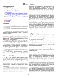SIGNIFICANCE AND USE 5.1 This test method is fully quantitative and it also avoids any loss of viable organisms through wash off, making it possible to produce statistically valid data using many fewer test and control carriers than other quantitative methods based on most probable numbers (MPN). 5.2 The design of the carriers makes it possible to place into each a precisely measured volume of the test suspension. The use of the threaded stir bars allows for efficient recovery of the inoculum even after its exposure for several hours to strong fixatives such as glutaraldehyde. 5.3 The membrane filtration step allows processing of the entire eluate from the test carriers and therefore the capture and subsequent detection of even low numbers of viable organisms that may be present. 5.4 This test can be performed with or without a soil load to determine the effect of such loading on microbicide performance. Consult the target regulatory agency on the need, type(s), and acceptable level(s) of soil load prior to testing. One type of soil load (Quantitative Disk Carrier Test Method E2197) to consider for this test is a mixture of three types of proteins (high molecular weight proteins, low molecular weight peptides, and mucous material) to represent the body secretions, excretions, or other extraneous substances that chemical microbicides may encounter under field conditions. It is suitable for working with the various test organisms included here. The components of the soil load are readily available and subject to much less variability than animal sera. 5.5 If distilled water or other diluent is not to be specified on the product label, the diluent for the test substance is assumed to be tap water. Since the quality of tap water varies considerably both geographically and temporally, this test method incorporates the use of water with a specified and documented level of hardness to prepare use-dilutions of test substance that require dilution in water before use. Consult the tar... SCOPE 1.1 This test method is designed for use in product development and for the generation of product potency data. This test method permits the loading of each carrier with a known volume of the test organism. The incorporation of controls can also determine the initial load of colony forming units (CFU) of organisms on the test carriers and any loss in CFU after the mandatory drying of the inoculum. 1.2 This test method is designed to have survivors and also to be used with a performance standard. The surviving microorganisms on each test carrier are compared to the mean of no less than three control carriers to determine if the performance standard has been met. To allow proper statistical evaluation of results, the size of the test inoculum should be sufficiently large to take into account both the performance standard and the experimental variation in the results. For example, if an arbitrary performance standard of 6-log10 reduction in the viability titer of the test organism is used, and an inoculum size of 107 CFU, then theoretically a maximum of ten survivors per carrier is permitted; however, because of experimental variability, the exact target may need to be higher than 106 CFU/carrier, thus fewer survivors would be permitted. 1.3 This test method should be performed by persons with training in microbiology and in facilities designed and equipped for work with infectious agents at the appropriate biosafety level (3). 1.4 In this test method, SI units are used for all applications, except for distance, in which case inches are used and SI units follow. 1.5 It is the responsibility of the investigator to determine whether Good Laboratory Practice Regulations (GLPs) are required and to follow them where appropriate (40 CFR Part 160 for EPA submissions and 21 CFR Part 58 for FDA submissions). 1.6 This standard does not purport to address all of the safety concerns, if any, associated with its use. It ...