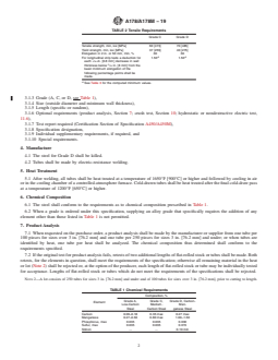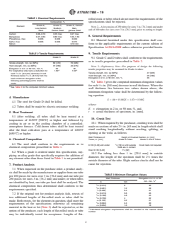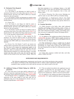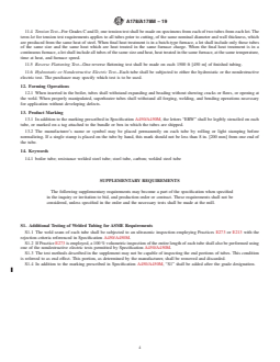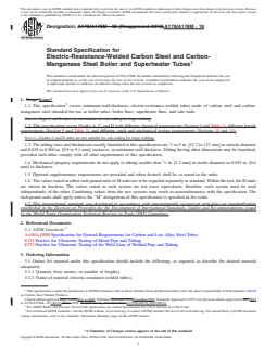 ABSTRACT This specification covers standards for electric-resistance-welded tubes with minimum-wall-thickness made of carbon steel and carbon-manganese steel to be used in boiler tubes, boiler flues, superheater flues, and safe ends. The steel shall be of Grades A (low-carbon steel), C (medium-carbon steel), or D (carbon-manganese steel). All tubes shall be submitted to heat treatment after welding, followed by cooling. The steel shall conform to stated compositions of carbon, manganese, phosphorus, sulphur, and silicon. Grades C and D shall conform to given tensile requirements, that is tensile strength, yield strength, and elongation. The material shall also be subjected to flattening, flange, tension, reverse flattening, and hydrostatic (or nondestructive electric) tests. Crush test shall also be performed if asked by the purchaser. Minimum elongation values are also given. SCOPE 1.1 This specification2 covers minimum-wall-thickness, electric-resistance-welded tubes made of carbon steel and carbon-manganese steel intended for use as boiler tubes, boiler flues, superheater flues, and safe ends. 1.2 This specification covers Grades A, C, and D with differing chemical requirements (Section 6 and Table 1), differing tensile requirements (Section 9 and Table 2), and differing crush and mechanical testing requirements (Sections 10 and 11). Note 1: Grades C and D tubes are not suitable for safe-ending for forge welding. 1.3 The tubing sizes and thicknesses usually furnished to this specification are 1/2 to 5 in. [12.7 to 127 mm] in outside diameter and 0.035 to 0.360 in. [0.9 to 9.1 mm], inclusive, in minimum wall thickness. Tubing having other dimensions may be furnished, provided such tubes comply with all other requirements of this specification. 1.4 Mechanical property requirements do not apply to tubing smaller than 1/8 in. [3.2 mm] in inside diameter or 0.015 in. [0.4 mm] in thickness. 1.5 Optional supplementary requirements are provided and when desired, shall be so stated in the order. 1.6 The values stated in either inch-pound units or SI units are to be regarded separately as standard. Within the text, the SI units are shown in brackets. The values stated in each system are not exact equivalents; therefore, each system must be used independently of the other. Combining values from the two systems may result in nonconformance with the specification. The inch-pound units shall apply unless the “M” designation of this specification is specified in the order. 1.7 This international standard was developed in accordance with internationally recognized principles on standardization established in the Decision on Principles for the Development of International Standards, Guides and Recommendations issued by the World Trade Organization Technical Barriers to Trade (TBT) Committee.