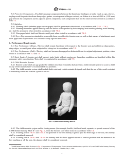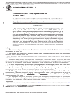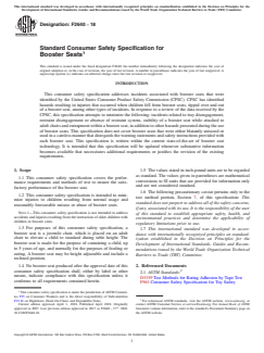 ASTM F2640-18 is a technical specification published by ASTM International. Its full title is "Standard Consumer Safety Specification for Booster Seats". This standard covers: SCOPE 1.1 This consumer safety specification covers the performance requirements and methods of test to ensure the satisfactory performance of the booster seat. 1.2 This consumer safety specification is intended to minimize injuries to children resulting from normal usage and reasonably foreseeable misuse or abuse of booster seats. Note 1: This consumer safety specification is not intended to address accidents and injuries resulting from the interaction of older children with children in booster seats. 1.3 For purposes of this consumer safety specification, a booster seat is a juvenile chair, which is placed on an adult chair to elevate a child to standard dining table height. The booster seat is made for the purpose of containing a child, up to 5 years of age, and normally for the purposes of feeding or eating. A booster seat may be height adjustable and include a reclined position. 1.4 No booster seat produced after the approval date of this consumer safety specification shall, either by label or other means, indicate compliance with this specification unless it conforms to all requirements contained herein. 1.5 The values stated in inch-pound units are to be regarded as standard. The values given in parentheses are mathematical conversions to SI units that are provided for information only and are not considered standard. 1.6 The following precautionary caveat pertains only to the test method portion, Section 7, of this specification: This standard does not purport to address all of the safety concerns, if any, associated with its use. It is the responsibility of the user of this standard to establish appropriate safety, health, and environmental practices and determine the applicability of regulatory limitations prior to use. 1.7 This international standard was developed in accordance with internationally recognized principles on standardization established in the Decision on Principles for the Development of International Standards, Guides and Recommendations issued by the World Trade Organization Technical Barriers to Trade (TBT) Committee.