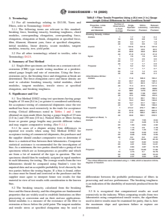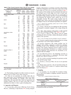 SIGNIFICANCE AND USE 5.1 Test Method D3822 using test specimens having gauge lengths of 10 mm [0.4 in.] or greater is considered satisfactory for acceptance testing of commercial shipments since the test method has been used extensively in the trade for acceptance testing. Critical differences noted in Tables 1 and 2 were obtained on man-made fibers having a gauge length of 25 mm [1.0 in.] and 250 mm [10 in.]. Natural fibers or fibers having lesser or greater gauge lengths may provide different values and may require comparative testing. (See 5.1.1.) (A) The critical differences were calculated using t = 1.960, which is based on infinite degrees of freedom. (A) The critical differences were calculated using t = 1.960, which is based on infinite degrees of freedom 5.1.1 In cases of a dispute arising from differences in reported test results when using Test Method D3822 for acceptance testing of commercial shipments, the purchaser and the supplier should conduct comparative tests to determine if there is a statistical bias between their laboratories. Competent statistical assistance is recommended for the investigation of bias. As a minimum, the two parties should take a group of test specimens which are as homogeneous as possible and which are from a lot of material of the type in question. The test specimens should then be randomly assigned in equal numbers to each laboratory for testing. The average results from the two laboratories should be compared using Student's t-test for unpaired data and an acceptable probability level chosen by the two parties before the testing begins. If a bias is found, either its cause must be found and corrected or the purchaser and the supplier must agree to interpret future test results for that material in view of test results with consideration to the known bias. 5.2 The breaking tenacity, calculated from the breaking force and the linear density, and the elongation are fundamental properties that are widely used to establish limitations on f... SCOPE 1.1 This test method covers the measurement of tensile properties of natural and man-made single textile fibers of sufficient length to permit mounting test specimens in a tensile testing machine. 1.2 This test method is also applicable to continuous (filament) and discontinuous (staple) fibers or filaments taken from yarns or tow. When the fibers to be tested contain crimp, or if the tow or yarns have been subjected to bulking, crimping, or texturing process, the tensile properties are determined after removal of the crimp. Note 1: Testing of filaments taken from yarns or tow, included in this test method was originally covered in Test Method D2101, that is discontinued. 1.3 The words “fiber” and “filament” are used interchangeably throughout this test method. 1.4 This test method is also applicable to fibers removed from yarns, or from yarns processed further into fabrics. It should be recognized that yarn and manufacturing processes can influence or modify the tensile properties of fibers. Consequently, tensile properties determined on fibers taken from yarns, or from yarns that have been processed into fabrics, may be different than for the same fibers prior to being subjected to yarn or fabric manufacturing processes. 1.5 This test method provides directions for measuring the breaking force and elongation at break of single textile fibers and for calculating breaking tenacity, initial modulus, chord modulus, tangent modulus, tensile stress at specified elongation, and breaking toughness. 1.6 Procedures for measuring the tensile properties of both conditioned and wet single fibers are included. The test method is applicable to testing under a wide range of conditions. 1.7 As the length of the test specimen decreases, the tensile strength is likely to increase, but the accuracy of the tensile properties determined may decrease, which may require the need to increase the number of test specimens. T...