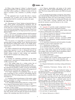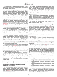 SIGNIFICANCE AND USE 5.1 This practice is designed to provide guidance to a panel inspector for quantitative and consistent evaluation of coating performance from test panels coated with marine antifouling coating systems. The practice assesses performance of coating systems based on both antifouling and physical properties. 5.2 The user is cautioned that the results are representative for the specific region and time of year in which the specimens are immersed. It shall be noted that interpretation of results will depend on the geographical location where the test is conducted, whether the coated specimens are exposed either totally or partially immersed, under static or dynamic conditions, and position and orientation. 5.3 Simultaneous testing of a proven standard antifouling coating system (known to minimize fouling accumulation, for example, containing biocide or active agent(s) to prevent fouling settlement/growth) in the specific marine environment shall be included as a reference to assist in interpretation of results. In addition, a negative control (inert surface susceptible to heavy fouling) shall be included on a regular basis. For the exposure to be valid, the surface of the negative control should show heavy fouling relative to the standard system(s). 5.4 Marine coating systems that produce positive results relevant to the standard system(s) show potential for use in protecting underwater marine structures. 5.5 The format can be utilized independent of exposure protocol and coating type, and provides the end user with a consistent practice and format for reporting of performance rating. SCOPE 1.1 This practice establishes a practice for evaluating degree of biofouling settlement on and physical performance of marine coating systems when panels coated with such coating systems are subjected to immersion conditions in a marine environment. Guidance for preparation or exposure and handling of test specimens can be found in related ASTM standards as noted below (see Section 2). 1.2 This practice and related exposure methodologies are designed as tools for the relative assessment of coating performance, and in no way are to be used as an absolute indicator of long-term performance under all conditions and in all environments. There can be high variability among and within exposure sites with respect to water quality and population or species of fouling organisms, and coating performance may vary with these and other properties. 1.3 The values stated in SI units are to be regarded as the standard. The values given in parentheses are for information only. 1.4 This standard does not purport to address all of the safety concerns, if any, associated with its use. It is the responsibility of the user of this standard to establish appropriate safety, health, and environmental practices and determine the applicability of regulatory limitations prior to use. A specific hazard statement is given in Section 6. 1.5 This international standard was developed in accordance with internationally recognized principles on standardization established in the Decision on Principles for the Development of International Standards, Guides and Recommendations issued by the World Trade Organization Technical Barriers to Trade (TBT) Committee.