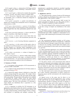 SIGNIFICANCE AND USE 5.1 This guide provides a means of using an LD instrument to obtain a droplet size distribution from a spray in gas co-flow that approximates a flux-sensitive sample.4 5.2 In many sprays, the experimenter shall account for spatial segregation of droplets by size. This guide provides a means of spatial averaging the droplet distribution. 5.3 The results obtained will be statistical in nature and refer to the time average of droplet size distribution of the entire spray. 5.4 This guide is used to calibrate a spray generation device to produce a desired droplet size distribution under prespecified environmental and co-flow conditions or characterize an unknown spray while minimizing the uncertainty in the measurement. SCOPE 1.1 The purpose of this guide is to define a test procedure for applying the laser diffraction (LD) method to estimate an average droplet size distribution that characterizes the flux of liquid droplets produced by a specified spray generation device under specified gas co-flow conditions using a specified liquid. The intended scope is limited to artificially generated sprays with high speed co-flow. The droplets are assumed to be in the size range of 1 µm to 2000 µm in diameter and occur in sprays that are contained within a volume as small as a few cubic centimetres or as large as a cubic metre. The droplet sizes are assumed to be distributed non-uniformly within the spray volume. 1.2 This guide is intended primarily to guide measurement of performance of nozzles and atomizers using LD instruments. 1.3 Non-uniform sprays require measurements across the entire spray cross section or through several chords providing a representative sample of the overall spray cross section. The aim of multiple-chord measurements is to obtain a single droplet size distribution that characterizes the whole spray rather than values from a single chordal measurement. 1.4 Use of this guide requires that the instrument does not interfere with spray production and does not significantly impinge upon or disturb the co-flow of gas and the spray. This technique is, therefore, considered non-intrusive. 1.5 The computation of droplet size distributions from the light-scattering distributions is done using Mie scattering theory or Fraunhofer diffraction approximation. The use of Mie theory accounts for light refracted through the droplet and there is a specific requirement for knowledge of both real (refractive) and imaginary (absorptive) components of the complex index of refraction. Mie theory also relies on an assumption of droplet homogeneity. The Fraunhofer diffraction approximation does not account for light refracted through the droplet and does not require knowledge of the index of refraction. 1.6 The instruments shall include data-processing capabilities to convert the LD scattering intensities into droplet size distribution parameters in accordance with Practice E799 and Test Method E1260. 1.7 The spray is visible and accessible to the collimated beam produced by the transmitter optics of the LD instrument. The shape and size of the spray shall be contained within the working distance of the LD system optics as specified by the instrument manufacturer. 1.8 The size range of the LD optic should be appropriate to the spray generation device under study. For example, the upper bound of the smallest droplet size class reported by the instrument shall be not more than 1/4 the size of DV0.1. 1.9 The values stated in SI units are to be regarded as standard. No other units of measurement are included in this standard. 1.10 This standard may involve hazardous materials, operations, and equipment. This standard does not purport to address all of the safety concerns, if any, associated with its use. It is the responsibility of the user of this standard to establish appropriate safety, health, and environmental practices and determine the applicability of regulatory lim...