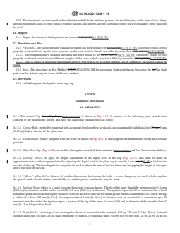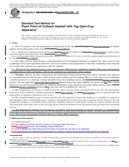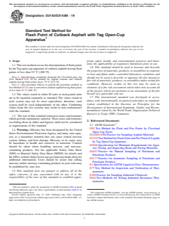 SIGNIFICANCE AND USE 4.1 This test method is useful in determining that an asphalt cutback has been prepared with solvents that meet the desired range of flammability, and that the product has not been contaminated with lower flash point solvents. Note 3: The quality of results produced by this standard is dependent on the competence of the personnel performing the procedure and the capability, calibration, and maintenance of the equipment used. Agencies that meet the criteria of Specification D3666 are generally considered capable of competent and objective testing, sampling, inspection, etc. Users of this standard are cautioned that compliance with Specification D3666 alone does not completely ensure reliable results. Reliable results depend on many factors; following the suggestions of Specification D3666 or some similar acceptable guidance provides a means of evaluating and controlling some of those factors. SCOPE 1.1 This test method covers the determination of flash points by the Tag open-cup apparatus of cutback asphalts having flash points of less than 93 °C [200 °F]. Note 1: Specifications commonly designate the Cleveland open cup (Test Method D92, IP 36) method for asphalt cements and cutback asphalts having flash points above 79 °C [175 °F]. Note 2: This procedure follows in general the procedure outlined in Test Method D1310, but is restricted to cutback asphalt having flash points of less than 93 °C [200 °F]. 1.2 The values stated in either SI units or inch-pound units are to be regarded separately as standard. The values stated in each system may not be exact equivalents; therefore, each system shall be used independently of the other. Combining values from the two systems may result in non-conformance with the standard. 1.3 The text of this standard references notes and footnotes which provide explanatory material. These notes and footnotes (excluding those in tables and figures) shall not be considered as requirements of the standard. 1.4 Warning—Mercury has been designated by the United States Environmental Protection Agency and many state agencies as a hazardous material that can cause central nervous system, kidney, and liver damage. Mercury, or its vapor, may be hazardous to health and corrosive to materials. Caution should be taken when handling mercury and mercury-containing products. See the applicable Safety Data Sheet (SDS) or Material Safety Data Sheet (MSDS) for details and the EPA’s website (http://www.epa.gov/mercury/index.htm) for additional information. Users should be aware that selling mercury and/or mercury-containing products in your state may be prohibited by state law. 1.5 This standard does not purport to address all of the safety concerns, if any, associated with its use. It is the responsibility of the user of this standard to establish appropriate safety, health, and environmental practices and determine the applicability of regulatory limitations prior to use. 1.6 This standard should be used to measure and describe the properties of materials, products, or assemblies in response to heat and flame under controlled laboratory conditions and should not be used to describe or appraise the fire hazard or fire risk of materials, products, or assemblies under actual fire conditions. However, results of this test may be used as elements of a fire risk assessment which takes into account all of the factors which are pertinent to an assessment of the fire hazard of a particular end use. 1.7 This international standard was developed in accordance with internationally recognized principles on standardization established in the Decision on Principles for the Development of International Standards, Guides and Recommendations issued by the World Trade Organization Technical Barriers to Trade (TBT) Committee.