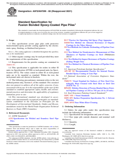 ASTM A972/A972M-00(2021) is a technical specification published by ASTM International. Its full title is "Standard Specification for Fusion Bonded Epoxy-Coated Pipe Piles". This standard covers: ABSTRACT This specification covers standard requirements for pipe piles with protective fusion-bonded epoxy powder coating applied by the electrostatic spray, flocking, or fluidized bed process. The surfaces of steel pipe piles to be coated shall be precleaned, as required. Steel surfaces shall be cleaned by abrasive blast cleaning to near-white metal. Prior to application of the fusion-bonded epoxy powder coatings, raised silvers, scabs, laps, sharp edges, or seams shall be removed using abrasive grinders. The powder coating shall be applied to cleaned steel surfaces before visible oxidation occurs. To achieve the required coating thickness, the steel shall be preheated prior to applying the powder coating. The heat source shall not leave a residue or contaminant on the steel surfaces. If oxidation occurs, the steel shall be cooled to ambient temperature and recleaned before applying the powder coating. The steel pipe piles shall be tested and shall meet the requirements for coating thickness and coating continuity. SCOPE 1.1 This specification covers pipe piles with protective fusion-bonded epoxy powder coating applied by the electrostatic spray, flocking, or fluidized bed process. Note 1: The coating applicator is identified throughout this specification as the manufacturer. 1.2 Other organic coatings may be used provided they meet the requirements of this specification. 1.3 Requirements for the powder coating are contained in Annex A1. 1.4 This specification is applicable for orders in either SI units (as Specification A972M) or inch-pound units [as Specification A972]. The values stated in either SI or inch-pound units are to be regarded as standard. Within the text, the inch-pound units are shown in brackets. 1.5 The following precautionary statement refers to the test method portion only, Section 8, of this standard: This standard does not purport to address all of the safety concerns, if any, associated with its use. It is the responsibility of the user of this standard to establish appropriate safety, health, and environmental practices and determine the applicability of regulatory limitations prior to use. 1.6 This international standard was developed in accordance with internationally recognized principles on standardization established in the Decision on Principles for the Development of International Standards, Guides and Recommendations issued by the World Trade Organization Technical Barriers to Trade (TBT) Committee.