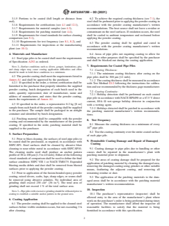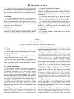 ABSTRACT This specification covers standard requirements for pipe piles with protective fusion-bonded epoxy powder coating applied by the electrostatic spray, flocking, or fluidized bed process. The surfaces of steel pipe piles to be coated shall be precleaned, as required. Steel surfaces shall be cleaned by abrasive blast cleaning to near-white metal. Prior to application of the fusion-bonded epoxy powder coatings, raised silvers, scabs, laps, sharp edges, or seams shall be removed using abrasive grinders. The powder coating shall be applied to cleaned steel surfaces before visible oxidation occurs. To achieve the required coating thickness, the steel shall be preheated prior to applying the powder coating. The heat source shall not leave a residue or contaminant on the steel surfaces. If oxidation occurs, the steel shall be cooled to ambient temperature and recleaned before applying the powder coating. The steel pipe piles shall be tested and shall meet the requirements for coating thickness and coating continuity. SCOPE 1.1 This specification covers pipe piles with protective fusion-bonded epoxy powder coating applied by the electrostatic spray, flocking, or fluidized bed process. Note 1: The coating applicator is identified throughout this specification as the manufacturer. 1.2 Other organic coatings may be used provided they meet the requirements of this specification. 1.3 Requirements for the powder coating are contained in Annex A1. 1.4 This specification is applicable for orders in either SI units (as Specification A972M) or inch-pound units [as Specification A972]. The values stated in either SI or inch-pound units are to be regarded as standard. Within the text, the inch-pound units are shown in brackets. 1.5 The following precautionary statement refers to the test method portion only, Section 8, of this standard: This standard does not purport to address all of the safety concerns, if any, associated with its use. It is the responsibility of the user of this standard to establish appropriate safety, health, and environmental practices and determine the applicability of regulatory limitations prior to use. 1.6 This international standard was developed in accordance with internationally recognized principles on standardization established in the Decision on Principles for the Development of International Standards, Guides and Recommendations issued by the World Trade Organization Technical Barriers to Trade (TBT) Committee.