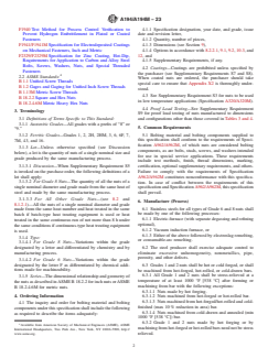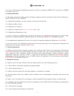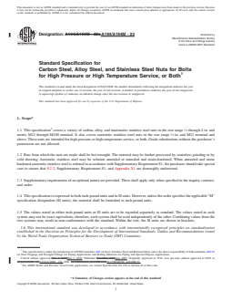 ABSTRACT This specification covers a variety of carbon, alloy, and martensitic and austenitic stainless steel nuts. These nuts are intended for high-pressure or high-temperature service, or both. Bars from which the nuts are made shall be hot-wrought. The material may be further processed by centerless grinding or by cold drawing. Austenitic stainless steel may be solution annealed or annealed and strain-hardened. Each alloy shall conform to the chemical composition requirements prescribed. Hardness tests, proof of load tests, and cone proof load tests shall be made to all nuts to meet the requirements specified. SCOPE 1.1 This specification2 covers a variety of carbon, alloy, and martensitic stainless steel nuts in the size range 1/4 through 4 in. and metric M12 through M100 nominal. It also covers austenitic stainless steel nuts in the size range 1/4 in. and M12 nominal and above. These nuts are intended for high-pressure or high-temperature service, or both. Grade substitutions without the purchaser's permission are not allowed. 1.2 Bars from which the nuts are made shall be hot-wrought. The material may be further processed by centerless grinding or by cold drawing. Austenitic stainless steel may be solution annealed or annealed and strain-hardened. When annealed and strain hardened austenitic stainless steel is ordered in accordance with Supplementary Requirement S1, the purchaser should take special care to ensure that 8.2.2, Supplementary Requirement S1, and Appendix X1 are thoroughly understood. 1.3 Supplementary requirements of an optional nature are provided. These shall apply only when specified in the inquiry, contract, and order. 1.4 This specification is expressed in both inch-pound units and in SI units. However, unless the order specifies the applicable “M” specification designation (SI units), the material shall be furnished to inch-pound units. 1.5 The values stated in either inch-pound units or SI units are to be regarded separately as standard. The values stated in each system may not be exact equivalents; therefore, each system shall be used independently of the other. Combining values from the two systems may result in non-conformance with the standard. Within the text, the SI units are shown in brackets. 1.6 This international standard was developed in accordance with internationally recognized principles on standardization established in the Decision on Principles for the Development of International Standards, Guides and Recommendations issued by the World Trade Organization Technical Barriers to Trade (TBT) Committee.