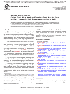 ASTM A194/A194M-23 is a technical specification published by ASTM International. Its full title is "Standard Specification for Carbon Steel, Alloy Steel, and Stainless Steel Nuts for Bolts for High Pressure or High Temperature Service, or Both". This standard covers: ABSTRACT This specification covers a variety of carbon, alloy, and martensitic and austenitic stainless steel nuts. These nuts are intended for high-pressure or high-temperature service, or both. Bars from which the nuts are made shall be hot-wrought. The material may be further processed by centerless grinding or by cold drawing. Austenitic stainless steel may be solution annealed or annealed and strain-hardened. Each alloy shall conform to the chemical composition requirements prescribed. Hardness tests, proof of load tests, and cone proof load tests shall be made to all nuts to meet the requirements specified. SCOPE 1.1 This specification2 covers a variety of carbon, alloy, and martensitic stainless steel nuts in the size range 1/4 through 4 in. and metric M12 through M100 nominal. It also covers austenitic stainless steel nuts in the size range 1/4 in. and M12 nominal and above. These nuts are intended for high-pressure or high-temperature service, or both. Grade substitutions without the purchaser's permission are not allowed. 1.2 Bars from which the nuts are made shall be hot-wrought. The material may be further processed by centerless grinding or by cold drawing. Austenitic stainless steel may be solution annealed or annealed and strain-hardened. When annealed and strain hardened austenitic stainless steel is ordered in accordance with Supplementary Requirement S1, the purchaser should take special care to ensure that 8.2.2, Supplementary Requirement S1, and Appendix X1 are thoroughly understood. 1.3 Supplementary requirements of an optional nature are provided. These shall apply only when specified in the inquiry, contract, and order. 1.4 This specification is expressed in both inch-pound units and in SI units. However, unless the order specifies the applicable “M” specification designation (SI units), the material shall be furnished to inch-pound units. 1.5 The values stated in either inch-pound units or SI units are to be regarded separately as standard. The values stated in each system may not be exact equivalents; therefore, each system shall be used independently of the other. Combining values from the two systems may result in non-conformance with the standard. Within the text, the SI units are shown in brackets. 1.6 This international standard was developed in accordance with internationally recognized principles on standardization established in the Decision on Principles for the Development of International Standards, Guides and Recommendations issued by the World Trade Organization Technical Barriers to Trade (TBT) Committee.