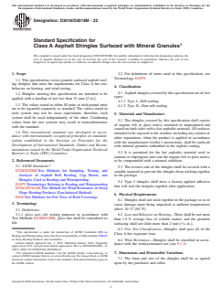 ASTM D3018/D3018M-22 is a technical specification published by ASTM International. Its full title is "Standard Specification for Class A Asphalt Shingles Surfaced with Mineral Granules". This standard covers: ABSTRACT This specification covers mineral granule-surfaced asphalt roofing shingles. Covered here are the self-sealing (Type I) and non-self-sealing (Type II) types of shingles. The shingles shall consist of organic felt or glass mat(s) saturated or impregnated, and coated on both sides with a hot asphaltic material and completely surfaced on the weather side with mineral granules embedded in the coating. The reverse side of the shingles shall be covered with a suitable material to prevent the shingles from sticking together in the package, causing possible damage upon being unpacked at ambient temperatures. Type I shingles shall have a factory-applied adhesive that will seal the shingles together after application. Both types shall meet the conditions for Class A fire exposure, and loss and behaviour on heating tests. Type I shingles shall pass an additional wind resistance test. SCOPE 1.1 This specification covers granule-surfaced asphalt roofing shingles that meet the requirements for Class A fire test, behavior on heating, and wind testing. 1.2 Shingles meeting this specification are intended to be applied with a headlap of not less than 51 mm [2 in.]. 1.3 The values stated in either SI units or inch-pound units are to be regarded separately as standard. The values stated in each system may not be exact equivalents; therefore, each system shall be used independently of the other. Combining values from the two systems may result in nonconformance with the standard. 1.4 This international standard was developed in accordance with internationally recognized principles on standardization established in the Decision on Principles for the Development of International Standards, Guides and Recommendations issued by the World Trade Organization Technical Barriers to Trade (TBT) Committee.