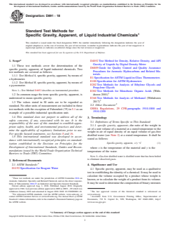 ASTM D891-18 is a standard published by ASTM International. Its full title is "Standard Test Methods for Specific Gravity, Apparent, of Liquid Industrial Chemicals". This standard covers: SIGNIFICANCE AND USE 4.1 Specific gravity, apparent, may be used as a qualitative test in establishing the identity of a chemical. It may be used to calculate the volume occupied by a product whose weight is known, or to calculate the weight of a product from its volume. It may be used to determine the composition of binary mixtures of pure chemicals. In the case of most refined industrial chemicals specific gravity, apparent, is of minimal value in defining quality, although it may detect gross contamination. 4.2 Of the two test methods described, the pycnometer method (Test Method B, 1.1.2) is the most accurate and precise. For this reason it is the preferred method in case of disputes. The hydrometer method (Test Method A, 1.1.1) is the least accurate and precise, but it is also the simplest and fastest to perform and is often entirely satisfactory for many purposes. If the sample is too viscous to permit the hydrometer to float freely, the pycnometer test method should be used. SCOPE 1.1 These test methods cover the determination of the specific gravity, apparent, of liquid industrial chemicals. Two test methods are covered as follows: 1.1.1 Test Method A, specific gravity, apparent, by means of a hydrometer. 1.1.2 Test Method B, specific gravity, apparent, by means of a pycnometer. Note 1: Test Method D4052 describes an instrumental procedure. 1.2 In common usage the term specific gravity, apparent, is understood to mean specific gravity. 1.3 The values stated in SI units are to be regarded as standard. No other units of measurement are included in these test methods with the exception of Fahrenheit (°F) in 5.1 as an example of a possible industrial specification unit. 1.4 This standard does not purport to address all of the safety concerns, if any, associated with its use. It is the responsibility of the user of this standard to establish appropriate safety, health, and environmental practices and determine the applicability of regulatory limitations prior to use. For specific hazard statements, see Sections 8 and 16. 1.5 This international standard was developed in accordance with internationally recognized principles on standardization established in the Decision on Principles for the Development of International Standards, Guides and Recommendations issued by the World Trade Organization Technical Barriers to Trade (TBT) Committee.