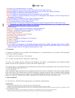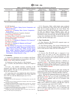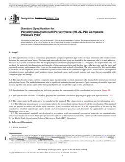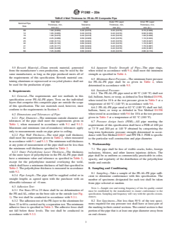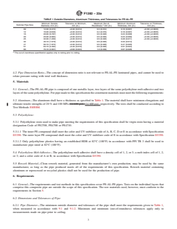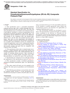 ASTM F1282-23a is a technical specification published by ASTM International. Its full title is "Standard Specification for Polyethylene/Aluminum/Polyethylene (PE-AL-PE) Composite Pressure Pipe". This standard covers: SCOPE 1.1 This specification covers a coextruded polyethylene composite pressure pipe with a welded aluminum tube reinforcement between the inner and outer layers. The inner and outer polyethylene layers are bonded to the aluminum tube by a melt adhesive. Included is a system of nomenclature for the polyethylene-aluminum-polyethylene (PE-AL-PE) pipes, the requirements and test methods for materials, the dimensions and strengths of the component tubes and finished pipe, adhesion tests, and the burst and sustained pressure performance. Also given are the requirements and methods of marking. The pipe covered by this specification is intended for use in potable water distribution systems for residential and commercial applications, water service, underground irrigation systems, and radient panel heating systems, baseboard, snow- and ice-melt systems, and gases that are compatible with composite pipe and fittings. 1.2 This specification relates only to composite pipes incorporating a welded aluminum tube having both internal and external polyethylene layers. The welded aluminium tube is capable of sustaining internal pressures. Pipes consisting of metallic layers not welded together and plastic layers other than polyethylene are outside the scope of this specification. 1.3 Specifications for connectors for use with pipe meeting the requirements of this specification are given in Annex A1. 1.4 This specification excludes crosslinked polyethylene-aluminum-crosslinked polyethylene pipes (see Specification F1281). 1.5 The values stated in SI units are to be regarded as the standard. The values given in parentheses are for information only. 1.6 The following precautionary caveat pertains only to the test methods portion, Section 9, of this specification: This standard does not purport to address all of the safety concerns, if any, associated with its use. It is the responsibility of the user of this standard to establish appropriate safety, health, and environmental practices and determine the applicability of regulatory limitations prior to use. 1.7 This international standard was developed in accordance with internationally recognized principles on standardization established in the Decision on Principles for the Development of International Standards, Guides and Recommendations issued by the World Trade Organization Technical Barriers to Trade (TBT) Committee.
