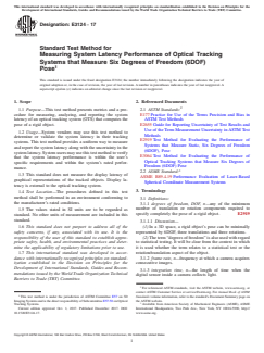 ASTM E3124-17 is a standard published by ASTM International. Its full title is "Standard Test Method for Measuring System Latency Performance of Optical Tracking Systems that Measure Six Degrees of Freedom (6DOF) Pose". This standard covers: SIGNIFICANCE AND USE 5.1 Optical tracking systems are used in a wide range of fields including: video games, film, neuroscience, biomechanics, flight/medical/industrial training, simulation, robotics, and automotive applications. 5.2 This standard provides a common set of metrics and a test procedure for evaluating the performance of optical tracking systems and may help to drive improvements and innovations in optical tracking systems.4 5.3 Potential users often have difficulty comparing optical tracking systems due to the lack of standard performance metrics and test methods, and must therefore rely on the vendor claims regarding the system’s performance, capabilities, and suitability for a particular application. This standard makes it possible for a user to assess and compare the performance of optical tracking systems, and allows the user to determine if the measured performance results are within the specifications with regard to the application requirements. SCOPE 1.1 Purpose—This test method presents metrics and a procedure for measuring, analyzing, and reporting the system latency of an optical tracking system (OTS) that computes the pose of a rigid object. 1.2 Usage—System vendors may use this test method to determine or validate the system latency in their tracking systems. This test method provides a uniform way to measure and report the system latency along with the uncertainty in the system latency. System users may use this test method to verify that the system latency performance is within the user’s specific requirements and within the system’s rated performance. 1.3 This standard does not measure the display latency of graphical representations of the tracked objects. Display latency is external to the optical tracking system. 1.4 Test Location—The procedures defined in this test method shall be performed in an environment conforming to the manufacturer’s rated conditions. 1.5 The values stated in SI units are to be regarded as standard. No other units of measurement are included in this standard. 1.6 This standard does not purport to address all of the safety concerns, if any, associated with its use. It is the responsibility of the user of this standard to establish appropriate safety, health, and environmental practices and determine the applicability of regulatory limitations prior to use. 1.7 This international standard was developed in accordance with internationally recognized principles on standardization established in the Decision on Principles for the Development of International Standards, Guides and Recommendations issued by the World Trade Organization Technical Barriers to Trade (TBT) Committee.