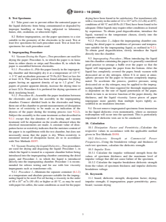 SIGNIFICANCE AND USE 5.1 Dissipation Factor and Relative Permittivity—Knowledge of these properties is important in the design of electrical equipment such as cables, transformers, insulators, and so forth. The numerical product of these two properties of a dielectric system is proportional to the energy loss converted to heat, and is called its loss index (see Terminology D1711). The energy loss reduces the efficiency of electrical equipment. The heat produced tends to chemically degrade the dielectric material and may even lead to thermal runaway. Test results of impregnated specimens can disclose significant differences between combinations of papers and oils that appear similar when the papers and the oils are tested separately. Dissipation factor, particularly at elevated temperatures, is often changed significantly by the presence of a small quantity of impurities in either the liquid or the paper. This practice is useful in the comparison of materials and in evaluating the effects of different papers on a given liquid. Judicious analysis of results with respect to time, temperature, and field strength are useful in predicting the performance and capabilities of systems using the paper and the liquid. For additional information on the significance of dissipation factor and relative permittivity, see Test Methods D150. 5.2 Test Method for Dielectric Breakdown Voltage and Dielectric Strength of Solid Electrical Insulating Materials at Commercial Power Frequencies: 5.2.1 A comprehensive discussion of the significance of the dielectric strength test as applied to solid, semi-solid, and liquid materials is given in Appendix X1 of Test Method D149. Other factors peculiar to high-quality composite insulations, such as oil-impregnated papers, are considered in the following: 5.2.2 In tests involving high electrical stresses, immersion of critical parts of a test circuit in oil is a widely used technique for inhibiting corona. However, it has limitations that must be recognized w... SCOPE 1.1 This practice covers the preparation of insulating paper and board impregnated with a liquid dielectric. Where this practice states only “paper,” the same procedure shall apply to board. 1.2 This practice has been found practicable for papers having nominal thickness of 0.05 mm (2 mil) and above. It has been used successfully for insulating board as thick as 6 mm (1/4 in.) when care is taken to ensure the specimen geometry necessary for valid measurement of dielectric properties. Suitable geometry depends on the electrode system used. Rigid solid opposing electrodes require flat specimens that have essentially parallel surfaces. 1.3 The values stated in SI units are to be regarded as standard. No other units of measurement are included in this standard. 1.4 This international standard was developed in accordance with internationally recognized principles on standardization established in the Decision on Principles for the Development of International Standards, Guides and Recommendations issued by the World Trade Organization Technical Barriers to Trade (TBT) Committee.