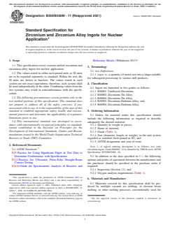 ABSTRACT This specification covers vacuum-melted zirconium and zirconium alloy ingots for nuclear application. Materials covered shall be produced by multiple vacuum arc melting, or electron beam melting, or other melting processes conventionally used for reactive metals. Unless otherwise specified, ingots shall be conditioned by machining or grinding or both to remove surface and subsurface defects detrimental to subsequent fabrication. The ingot shall conform to the chemical composition requirements prescribed. The ingots shall be analyzed for the alloying and impurity elements prescribed. Ingots shall be inspected ultrasonically using the prescribed methods. The test shall be conducted in accordance with practice E 114. SIGNIFICANCE AND USE 10.1 For purposes of determining compliance with the specified limits for requirements of the properties listed in Table 1 and Table 2, an observed value or a calculated value shall be rounded as indicated in accordance with the rounding method of Practice E29. SCOPE 1.1 This specification covers vacuum-melted zirconium and zirconium alloy ingots for nuclear application. 1.2 The values stated in either inch-pound units or SI units are to be regarded separately as standard. Within the text, the SI units are shown in brackets. The values stated in each system are not exact equivalents; therefore, each system shall be used independently of the other. Combining values from the two systems may result in nonconformance with the specification. 1.3 The following precautionary caveat pertains only to the test method portions of this specification: This standard does not purport to address all of the safety concerns, if any, associated with its use. It is the responsibility of the user of this standard to establish appropriate safety, health, and environmental practices and determine the applicability of regulatory limitations prior to use. 1.4 This international standard was developed in accordance with internationally recognized principles on standardization established in the Decision on Principles for the Development of International Standards, Guides and Recommendations issued by the World Trade Organization Technical Barriers to Trade (TBT) Committee.