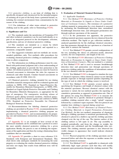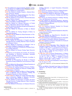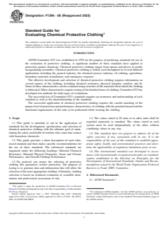 ASTM F1296-08(2023) is a guide published by ASTM International. Its full title is "Standard Guide for Evaluating Chemical Protective Clothing". This standard covers: SIGNIFICANCE AND USE 4.1 The standards under the jurisdiction of Committee F23 and other technical committees can be used individually or as part of an integrated protocol in the development, selection, specification, and use of chemical protective clothing. 4.2 The standards are intended as a means by which information can be requested, generated, and reported in a consistent, comparable manner. 4.3 The suggested evaluation and test methods are recommended guidelines only. Test methods offer procedures for evaluating chemical protective clothing at standardized conditions to allow comparison. 4.4 The information on clothing performance must be combined with professional judgment and a clear understanding of the clothing application to provide the best protection to the worker. All chemical protective clothing use must be based on a hazard assessment to determine the risks for exposure to chemicals and other hazards. Conduct hazard assessments in accordance with 29 CFR 1910.132. 4.5 Chemical protective clothing intended for use during hazardous materials emergencies shall be evaluated against and conform to NFPA 1991, Standard on Vapor-Protective Ensemble for Hazardous Materials Emergencies, or NFPA 1992, Standard on Liquid Splash-Protective Ensemble and Clothing for Hazardous Materials Emergencies, as appropriate for the type of emergency. For emergencies involving release of chemical agents during terrorism incidents, chemical protective clothing shall be evaluated against and conform to NFPA 1994, Standard on Protective Ensemble for Chemical/Biological Terrorism Incidents. 4.6 Recommendations for labeling chemical protective clothing are provided in Practice F1301, recommendations for implementing a chemical protective clothing program are provided in Practice F1461, and recommendations for preparing care and maintenance instructions are provided in Practice F2061. 4.7 Appendix X1 is an example of how several of the referenced standards can be combined into a protoc... SCOPE 1.1 This guide is intended to aid in the application of standards for the development, specification, and selection of chemical protective clothing with the ultimate goal of maintaining the safety and health of workers who come into contact with hazardous chemicals. 1.2 This guide provides a short description of each referenced standard and then makes specific recommendations for the use of these standards. The referenced standards are organized under the following headings: Material Chemical Resistance, Material Physical Properties, Seam and Closure Performance, and Overall Clothing Performance. 1.3 No protocol can ensure the selection of protective clothing that guarantees worker protection. The purpose of testing is to generate data and information that will allow the selection of the most appropriate clothing. Ultimately, clothing selection is based on technical evaluation of available information and professional assessment of risk. 1.4 The values stated in SI units or in other units shall be regarded separately as standard. The values stated in each system must be used independently of the other, without combining values in any way. 1.5 This standard does not purport to address all of the safety concerns, if any, associated with its use. It is the responsibility of the user of this standard to establish appropriate safety, health, and environmental practices and determine the applicability of regulatory limitations prior to use. 1.6 This international standard was developed in accordance with internationally recognized principles on standardization established in the Decision on Principles for the Development of International Standards, Guides and Recommendations issued by the World Trade Organization Technical Barriers to Trade (TBT) Committee.