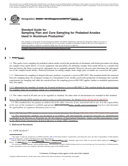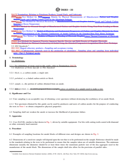 SIGNIFICANCE AND USE 4.1 Core sampling is an acceptable way of obtaining a test specimen without destroying the usefulness of an anode block. 4.1.1 Test specimen obtained by this guide can be used by producers and users of carbon anodes for the purpose of conducting the tests in Note 1 to obtain comparative physical properties. 4.2 Sampling shall not weaken the anode or increase the likelihood of premature failure. SCOPE 1.1 This guide covers sampling for prebaked carbon anodes used in the production of aluminum, and details procedures for taking test samples from anode blocks. It covers equipment and procedures for obtaining samples from anode blocks in a manner that does not destroy the block or prevent its subsequent use as originally intended. However, the user must determine the subsequent use of the sampled anode blocks. Preferred locations for taking samples from single units of anodes are covered in this guide. 1.1.1 Information for sampling of shaped refractory products, in general, is given in ISO 5022. This standard details the statistical basis for sampling plans for acceptance testing of a consignment or lot. Anodes used in the production of aluminum have specific requirements for sampling and while the statistical basis for sampling given in ISO 5022 applies, further or modified requirements may also apply. 1.1.2 Information for sampling of anodes for Al-metal production is given in ISO 8007-2. This standard details the statistical basis for sampling plans for acceptance testing of a consignment or lot. 1.2 The values stated in SI units are to be regarded as standard. No other units of measurement are included in this standard. Note 1: The following ASTM standards are noted as sources of useful information: Test Methods D5502, D6120, D6744, and D6745. 1.3 This standard does not purport to address all of the safety concerns, if any, associated with its use. It is the responsibility of the user of this standard to establish appropriate safety, health, and environmental practices and determine the applicability of regulatory limitations prior to use. 1.4 This international standard was developed in accordance with internationally recognized principles on standardization established in the Decision on Principles for the Development of International Standards, Guides and Recommendations issued by the World Trade Organization Technical Barriers to Trade (TBT) Committee.