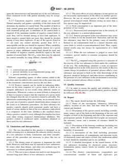SIGNIFICANCE AND USE 5.1 This practice provides a means of measuring the susceptibility of an avian species to a test substance in its diet under controlled conditions. The LC50 obtained in this test is a conditional measure of subacute toxicity because consumption is voluntary, and because the dietary route may introduce metabolic transformations of the test substance that might be absent in other exposure techniques. 5.2 Use of this practice contributes to the evaluation of the hazards of chemicals to birds because exposure is analogous to most field exposures, that is, through dietary intake. 5.3 The use of this practice allows for observation of signs of toxicity in addition to mortality. 5.4 The dose-response curve provides additional information about the response of birds to a test substance. 5.5 This practice can be used to study the effects of test substances in combination in order to simulate situations where birds may be exposed to more than one substance simultaneously (1).3 5.6 This practice provides one basis for deciding whether additional toxicity testing should be conducted with birds. SCOPE 1.1 This practice describes a procedure for determining the subacute dietary toxicity of a test substance administered to birds in their daily diet. The LC50 value time to mortality and slope of the dose response curve may also be derived. 1.2 This practice is applicable to substances that can be mixed uniformly into the diet. 1.3 This practice is intended primarily to be used with the young of the following species: northern bobwhite (Colinus virginianus), Japanese quail (Coturnix japonica), mallard (Anas platyrhynchos), and ring-necked pheasant (Phasianus colchicus). Other species or age groups, for example, with wild-trapped birds, may be used with appropriate husbandry modifications to the practice. 1.4 This standard is used routinely to address avian regulatory testing requirements. Modifications to the procedures described in this standard have been proposed and are being evaluated to better address the needs of the latest risk assessment procedures. Specifically, the latest procedures call for individual bird feed consumption measurements so that a more precise dose can be determined. While such procedures may replace procedures described in the current standard, there is no certainty that the newest procedures will work as anticipated, and validation is not complete. Therefore, the current guideline has utility prior to validation and acceptance of a modified standard. 1.5 This standard does not purport to address all of the safety concerns, if any, associated with its use. It is the responsibility of the user of this standard to establish appropriate safety, health, and environmental practices and determine the applicability of regulatory limitations prior to use. For specific precautionary statements see Section 6. 1.6 This international standard was developed in accordance with internationally recognized principles on standardization established in the Decision on Principles for the Development of International Standards, Guides and Recommendations issued by the World Trade Organization Technical Barriers to Trade (TBT) Committee.