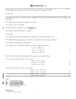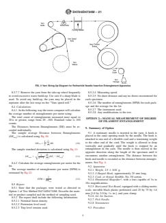 ASTM D4724/D4724M-21 is a standard published by ASTM International. Its full title is "Standard Test Method for Entanglements in Filament Yarns by Needle Insertion". This standard covers: SIGNIFICANCE AND USE 5.1 Option 1 of this test method is for the determination of the degree of filament yarn entanglement, as measured instrumentally. It is used for acceptance testing of commercial shipments; however, caution is advised because information on between-laboratory precision is lacking. Comparative tests, as directed in 5.1.1, may be advisable. 5.1.1 If there are differences of practical significance between the reported test results for two or more laboratories, comparative tests should be performed by those laboratories to determine if there is a statistical bias between them, using competent statistical assistance. As a minimum, samples used for each comparative test should be as homogeneous as possible, drawn from the same lot of material as the samples that results in disparate results during initial testing, and randomly assigned in equal numbers to each laboratory. Other fabrics with established test values may be used for this purpose. The test results from the laboratories involved should be compared statistically. If a bias is found, either its cause must be found and corrected or future test results must be adjusted in consideration of the known bias. 5.2 Option 2 for this test method is intended for use when the supply of yarn is limited. 5.3 The instrumental option of this test method, Option 1, is based on the total randomization of the entanglements in the yarn; therefore, the distance measured between the point of insertion of a pin in the middle of the yarn and the point at which an entanglement is encountered, by movement of the yarn or the pin until it is stopped at a preset level of force, is representative of the distance between two entanglements at some location in the yarn. 5.4 Entanglements are used frequently instead of twist to ensure the integrity of filament yarns. Such entanglements generally give somewhat less protection during weaving or knitting than twist, but with proper care, will perform quite satisfactorily. SCOPE 1.1 This test method covers two options for the measurement of entanglements in filament yarns using needle insertion options for instrument (Option 1) (Option 2) techniques. 1.2 The values stated in either SI units or inch-pound units are to be regarded separately as standard. The values stated in each system are not necessarily exact equivalents; therefore, to ensure conformance with the standard, each system shall be used independently of the other, and values from the two systems shall not be combined. 1.3 This standard does not purport to address all of the safety concerns, if any, associated with its use. It is the responsibility of the user of this standard to establish appropriate safety, health, and environmental practices and determine the applicability of regulatory limitations prior to use. 1.4 This international standard was developed in accordance with internationally recognized principles on standardization established in the Decision on Principles for the Development of International Standards, Guides and Recommendations issued by the World Trade Organization Technical Barriers to Trade (TBT) Committee.