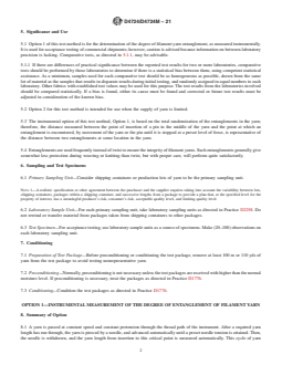 SIGNIFICANCE AND USE 5.1 Option 1 of this test method is for the determination of the degree of filament yarn entanglement, as measured instrumentally. It is used for acceptance testing of commercial shipments; however, caution is advised because information on between-laboratory precision is lacking. Comparative tests, as directed in 5.1.1, may be advisable. 5.1.1 If there are differences of practical significance between the reported test results for two or more laboratories, comparative tests should be performed by those laboratories to determine if there is a statistical bias between them, using competent statistical assistance. As a minimum, samples used for each comparative test should be as homogeneous as possible, drawn from the same lot of material as the samples that results in disparate results during initial testing, and randomly assigned in equal numbers to each laboratory. Other fabrics with established test values may be used for this purpose. The test results from the laboratories involved should be compared statistically. If a bias is found, either its cause must be found and corrected or future test results must be adjusted in consideration of the known bias. 5.2 Option 2 for this test method is intended for use when the supply of yarn is limited. 5.3 The instrumental option of this test method, Option 1, is based on the total randomization of the entanglements in the yarn; therefore, the distance measured between the point of insertion of a pin in the middle of the yarn and the point at which an entanglement is encountered, by movement of the yarn or the pin until it is stopped at a preset level of force, is representative of the distance between two entanglements at some location in the yarn. 5.4 Entanglements are used frequently instead of twist to ensure the integrity of filament yarns. Such entanglements generally give somewhat less protection during weaving or knitting than twist, but with proper care, will perform quite satisfactorily. SCOPE 1.1 This test method covers two options for the measurement of entanglements in filament yarns using needle insertion options for instrument (Option 1) (Option 2) techniques. 1.2 The values stated in either SI units or inch-pound units are to be regarded separately as standard. The values stated in each system are not necessarily exact equivalents; therefore, to ensure conformance with the standard, each system shall be used independently of the other, and values from the two systems shall not be combined. 1.3 This standard does not purport to address all of the safety concerns, if any, associated with its use. It is the responsibility of the user of this standard to establish appropriate safety, health, and environmental practices and determine the applicability of regulatory limitations prior to use. 1.4 This international standard was developed in accordance with internationally recognized principles on standardization established in the Decision on Principles for the Development of International Standards, Guides and Recommendations issued by the World Trade Organization Technical Barriers to Trade (TBT) Committee.