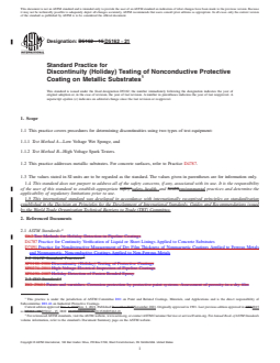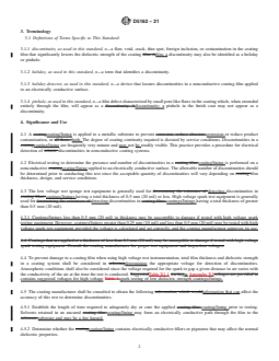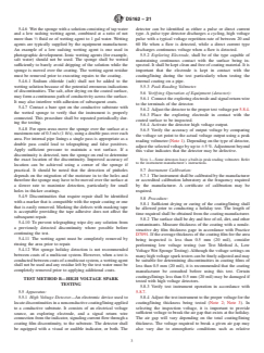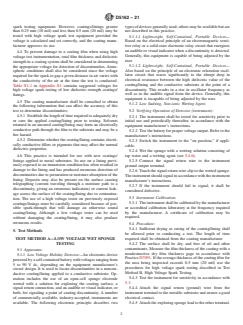 SIGNIFICANCE AND USE 4.1 A coating/lining is applied to a metallic substrate to prevent corrosion or reduce product contamination, or both. The degree of coating continuity required is dictated by service conditions. Discontinuities in a coating/lining are frequently very minute and may not be readily visible. This practice provides a procedure for electrical detection of discontinuities in nonconductive coating systems. 4.2 Electrical testing to determine the presence and number of discontinuities in a coating/lining is performed on a nonconductive coating/lining applied to an electrically conductive surface. The allowable number of discontinuities should be determined prior to conducting this test since the acceptable quantity of discontinuities will vary depending on film thickness, design, and service conditions. 4.3 The low voltage wet sponge test equipment is generally used for detecting discontinuities in coatings/linings having a total thickness of 0.5 mm (20 mil) or less. High voltage spark test equipment is generally used for detecting discontinuities in coatings/linings having a total thickness of greater than 0.5 mm (20 mil). 4.3.1 Coatings/linings less than 0.5 mm (20 mil) in thickness may be susceptible to damage if tested with high voltage spark testing equipment. However, coatings/linings greater than 0.25 mm (10 mil) and less than 0.5 mm (20 mil) may be tested with high voltage spark test equipment provided the voltage is calculated and set correctly, and the coating manufacturer approves its use. 4.4 To prevent damage to a coating film when using high voltage test instrumentation, total film thickness and dielectric strength in a coating system shall be considered in determining the appropriate voltage for detection of discontinuities. Atmospheric conditions shall also be considered since the voltage required for the spark to gap a given distance in air varies with the conductivity of the air at the time the test is conducted. Table X1.1 in Appendix X1 cont... SCOPE 1.1 This practice covers procedures for determining discontinuities using two types of test equipment: 1.1.1 Test Method A—Low Voltage Wet Sponge, and 1.1.2 Test Method B—High Voltage Spark Testers. 1.2 This practice addresses metallic substrates. For concrete surfaces, refer to Practice D4787. 1.3 The values stated in SI units are to be regarded as the standard. The values given in parentheses are for information only. 1.4 This standard does not purport to address all of the safety concerns, if any, associated with its use. It is the responsibility of the user of this standard to establish appropriate safety, health, and environmental practices and determine the applicability of regulatory limitations prior to use. 1.5 This international standard was developed in accordance with internationally recognized principles on standardization established in the Decision on Principles for the Development of International Standards, Guides and Recommendations issued by the World Trade Organization Technical Barriers to Trade (TBT) Committee.