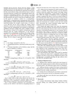 4.4 To prevent damage to a coating film when using high voltage test instrumentation, total film thickness and dielectric strength in a coating system shall be considered in determining the appropriate voltage for detection of discontinuities. Atmospheric conditions shall also be considered since the voltage required for the spark to gap a given distance in air varies with the conductivity of the air at the time the test is conducted. Table X1.1 in Appendix X1 cont...