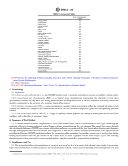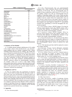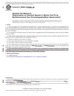 SIGNIFICANCE AND USE 5.1 The test method allows the quantitation of chemical species at low levels in marine fuel oils and cutter stocks. A great many types and concentrations of chemical species are found in marine fuel oils. A root cause relationship between the presence of such species or their concentration in fuels and any failure modes allegedly induced by the use of these fuels has not been established. This test method is necessary to establish test conditions required for future ISO 8217:2010 as defined in section 5.5 and Annex B item (d). Additional compounds may be determined by using the same conditions and by selecting required mass spectral selected ions, accordingly. SCOPE 1.1 This test method covers the quantitative determination of a variety of chemical species in marine fuel oil (bunker fuel oil) by gas chromatography/mass spectrometry. By using the same conditions and by selecting required mass spectral selected ions, the test method may be used for the determination of other species than those for which precision statements and limits of detection have been established. 1.2 An example list of chemical species for which a limit of quantification has been determined by means of this test method is given in Table 1. 1.3 Other refinery hydrocarbon fractions and their mixtures may be tested using the same test method conditions. However, the precision of this test method reflects the compounds in Table 1. 1.4 Results are reported to the nearest 1.0 mg/kg. 1.5 The values stated in SI units are to be regarded as standard. 1.5.1 Exception—Non-SI values are given for psig. 1.6 This standard does not purport to address all of the safety concerns, if any, associated with its use. It is the responsibility of the user of this standard to establish appropriate safety, health, and environmental practices and determine the applicability of regulatory limitations prior to use. 1.7 This international standard was developed in accordance with internationally recognized principles on standardization established in the Decision on Principles for the Development of International Standards, Guides and Recommendations issued by the World Trade Organization Technical Barriers to Trade (TBT) Committee.