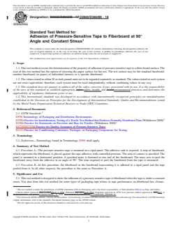 SIGNIFICANCE AND USE 5.1 This test method is designed to show the adhesion of a pressure-sensitive tape to fiberboard when the tape is under a constant stress. Test data from this test method for some types of packaging tape relates to tape performance on fiberboard box closure. 5.2 Procedure A should be used when comparing tapes to an established requirement. The requirement may be established using either the standard linerboard or another linerboard representing a specific fiberboard. 5.3 Procedure B should be used to rank tapes as to their ability to adhere to fiberboard. SCOPE 1.1 This test method covers the determination of the property of adhesion of pressure-sensitive tape to a fiber-board surface. The user of this test method has the option of choosing the paper surface for the test. The test surface may be the standard linerboard, another linerboard (or paper) of individual interest, or a specific fiberboard. 1.2 The values stated in either SI or inch-pound units are to be regarded separately as standard. The values stated in each system are not exact equivalents; therefore, each system must be used independently, without combining values in any way. 1.3 This standard does not purport to address all of the safety concerns, if any, associated with its use. It is the responsibility of the user of this standard to establish appropriate safety, health, and environmental practices and determine the applicability of regulatory limitations prior to use. 1.4 This international standard was developed in accordance with internationally recognized principles on standardization established in the Decision on Principles for the Development of International Standards, Guides and Recommendations issued by the World Trade Organization Technical Barriers to Trade (TBT) Committee.