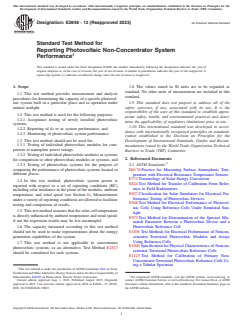 ASTM E2848-13(2023): Standard Test Method for Reporting Photovoltaic Non-Concentrator System Performance establishes reliable procedures for measuring and analyzing the capacity and performance of operational photovoltaic (PV) systems that do not use concentrator technology, under natural sunlight. This widely recognized ASTM standard is essential for acceptance testing, system performance reporting, and ongoing monitoring of PV systems.