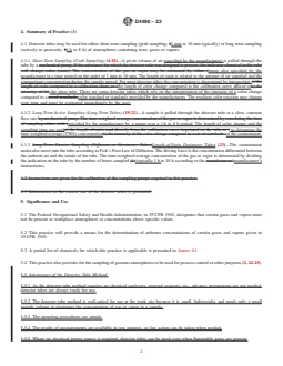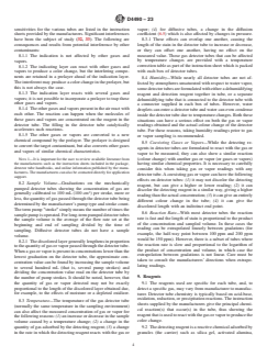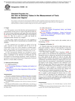 ASTM D4490-23 is a standard published by ASTM International. Its full title is "Standard Practice for the Use of Detector Tubes in the Measurement of Toxic Gases and Vapors". This standard covers: SIGNIFICANCE AND USE 5.1 The Federal Occupational Safety and Health Administration, in 29 CFR 1910, designates that certain gases and vapors must not be present in workplace atmospheres at concentrations above specific values. 5.2 This practice will provide a means for the determination of airborne concentrations of certain gases and vapors given in 29 CFR 1910. 5.3 A partial list of chemicals for which this practice is applicable is presented in Annex A1. 5.4 This practice also provides for the sampling of gaseous atmospheres to be used for process control or other purposes (2, 24-23). 5.5 Advantages of the Detector Tube Method: 5.5.1 As the detector tube method requires no chemical analyzers, external reagents, etc., advance preparations are not needed; detector tubes are always ready for use. 5.5.2 The detector tube method is well-suited for use at the work site because it is small, lightweight, and needs only a small sample volume to determine the concentration of gas or vapor in a sample. 5.5.3 The operating procedures are simple. 5.5.4 The results of measurements are available in just minutes, so fast action can be taken when needed. 5.5.5 Where no electrical power source is required, detector tubes can be used even when flammable gases are present. 5.5.6 Different types of detector tubes are available for different gases and measuring ranges, from 0.01 ppm to more than 10 %, depending on analyte and tube design, making the system flexible tor different sampling situations. SCOPE 1.1 This practice covers the detection and measurement of concentrations of toxic gases or vapors using detector tubes (1, 2).2 A list of some of the gases and vapors that can be detected by this practice and their measurement ranges are provided in Annex A1. This list is given as a guide and should be considered neither absolute nor complete. 1.2 The values stated in SI units are to be regarded as standard. No other units of measurement are included in this standard. 1.3 This standard does not purport to address all of the safety concerns, if any, associated with its use. It is the responsibility of the user of this standard to establish appropriate safety, health, and environmental practices and determine the applicability of regulatory limitations prior to use. 1.4 This international standard was developed in accordance with internationally recognized principles on standardization established in the Decision on Principles for the Development of International Standards, Guides and Recommendations issued by the World Trade Organization Technical Barriers to Trade (TBT) Committee.