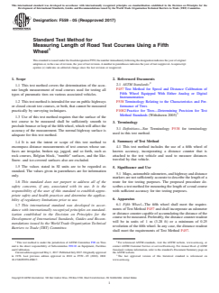 SIGNIFICANCE AND USE 5.1 Maps, automobile odometers, and highway and distance markers are not sufficiently accurate to describe the length of a route for tire testing purposes. The proposed procedure describes a test method for measuring the length of a road course with sufficient accuracy for tire testing purposes. SCOPE 1.1 This test method covers the determination of the accurate length measurement of road courses used for testing all types of pneumatic tires on various associated vehicles. 1.2 This test method is intended for use on public highways or closed circuit test courses, or both, that cannot be measured practically by surveying techniques. 1.3 Use of this test method requires that the surface of the test course to be measured shall be sufficiently smooth to preclude bounce or hop of the fifth wheel, which will affect the accuracy of the measurement. The normal highway surface is adequate for this test method. 1.4 It is not the intent or scope of this test method to encompass distance measurements of test courses whose surfaces are irregular, broken up, jagged, and so forth, such as rock courses, Belgian block, “rumble” surfaces, and the like. Snow- and ice-covered surfaces also are excluded. 1.5 The values stated in SI units are to be regarded as standard. The values given in parentheses are for information only. 1.6 This standard does not purport to address all of the safety concerns, if any, associated with its use. It is the responsibility of the user of this standard to establish appropriate safety and health practices and determine the applicability of regulatory limitations prior to use. 1.7 This international standard was developed in accordance with internationally recognized principles on standardization established in the Decision on Principles for the Development of International Standards, Guides and Recommendations issued by the World Trade Organization Technical Barriers to Trade (TBT) Committee.