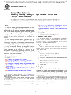 ASTM D4699-23 is a standard published by ASTM International. Its full title is "Standard Test Method for Vibratory Packing Density of Large Formed Catalyst and Catalyst Carrier Particles". This standard covers: SIGNIFICANCE AND USE 5.1 This test method is used for measuring the vibratory packing density of formed particles used in fixed bed reactors, driers, and so forth. SCOPE 1.1 This test method covers the determination of the vibratory packing density of formed catalyst and catalyst carrier particles that will not break up significantly under test conditions. For the purpose of this test, catalyst particles are defined as extrudates, spheres or formed pellets greater than 4.8 mm. 1.2 The values stated in SI units are to be regarded as standard. No other units of measurement are included in this standard. 1.3 This standard does not purport to address all of the safety concerns, if any, associated with its use. It is the responsibility of the user of this standard to establish appropriate safety, health, and environmental practices and determine the applicability of regulatory limitations prior to use. 1.4 This international standard was developed in accordance with internationally recognized principles on standardization established in the Decision on Principles for the Development of International Standards, Guides and Recommendations issued by the World Trade Organization Technical Barriers to Trade (TBT) Committee.