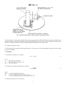 SIGNIFICANCE AND USE 5.1 This test method is used for measuring the vibratory packing density of formed particles used in fixed bed reactors, driers, and so forth. SCOPE 1.1 This test method covers the determination of the vibratory packing density of formed catalyst and catalyst carrier particles that will not break up significantly under test conditions. For the purpose of this test, catalyst particles are defined as extrudates, spheres or formed pellets greater than 4.8 mm. 1.2 The values stated in SI units are to be regarded as standard. No other units of measurement are included in this standard. 1.3 This standard does not purport to address all of the safety concerns, if any, associated with its use. It is the responsibility of the user of this standard to establish appropriate safety, health, and environmental practices and determine the applicability of regulatory limitations prior to use. 1.4 This international standard was developed in accordance with internationally recognized principles on standardization established in the Decision on Principles for the Development of International Standards, Guides and Recommendations issued by the World Trade Organization Technical Barriers to Trade (TBT) Committee.