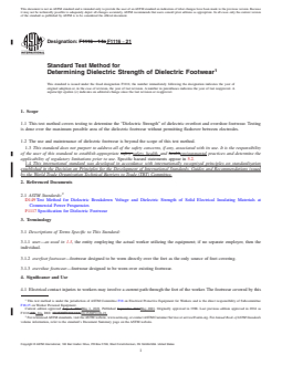 1.1 This test method covers testing to determine the “Dielectric Strength” of dielectric overfoot and overshoe footwear. Testing