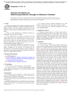 ASTM F1116-21 is a standard published by ASTM International. Its full title is "Standard Test Method for Determining Dielectric Strength of Dielectric Footwear". This standard covers: SIGNIFICANCE AND USE 4.1 Electrical contact injuries to workers may involve a current path through the feet of the worker. The footwear covered by this specification is dielectrically rated to provide additional insulation and isolation to the wearer. This test method will determine that dielectric footwear has dielectric integrity at the time of the test. SCOPE 1.1 This test method covers testing to determine the “Dielectric Strength” of dielectric overfoot and overshoe footwear. Testing is done over the maximum possible area of the dielectric footwear without permitting flashover between electrodes. 1.2 The use and maintenance of dielectric footwear is beyond the scope of this test method. 1.3 This standard does not purport to address all of the safety concerns, if any, associated with its use. It is the responsibility of the user of this standard to establish appropriate safety, health, and environmental practices and determine the applicability of regulatory limitations prior to use. Specific hazard statements appear in 5.2. 1.4 This international standard was developed in accordance with internationally recognized principles on standardization established in the Decision on Principles for the Development of International Standards, Guides and Recommendations issued by the World Trade Organization Technical Barriers to Trade (TBT) Committee.