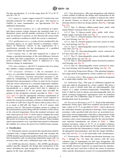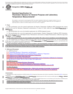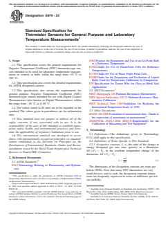 ASTM E879-20 is a technical specification published by ASTM International. Its full title is "Standard Specification for Thermistor Sensors for General Purpose and Laboratory Temperature Measurements". This standard covers: ABSTRACT This specification covers the classification, testing, and corresponding requirements for negative-temperature-coefficient thermistor-type sensors intended to be used for clinical laboratory temperature measurements or control, or both, within a specified range. This specification also covers the detailed requirements for ASTM designated sensors. SCOPE 1.1 This specification covers the general requirements for Negative Temperature Coefficient (NTC) thermistor-type sensors intended to be used for laboratory temperature measurements or control, or both, within the range from −10 °C to 105 °C. 1.2 This specification also covers the detailed requirements for ASTM designated sensors. 1.3 This specification also covers the requirements for general purpose, Negative Temperature Coefficient (NTC) thermistor-type sensors intended for use with Digital Contact Thermometers (also known as Digital Thermometers) within the range from –50 °C to +150 °C. 1.4 The values stated in SI units are to be regarded as the standard. The values given in parentheses are for information only. 1.5 This standard does not purport to address all of the safety concerns, if any, associated with its use. It is the responsibility of the user of this standard to establish appropriate safety, health, and environmental practices and determine the applicability of regulatory limitations prior to use. 1.6 This international standard was developed in accordance with internationally recognized principles on standardization established in the Decision on Principles for the Development of International Standards, Guides and Recommendations issued by the World Trade Organization Technical Barriers to Trade (TBT) Committee.