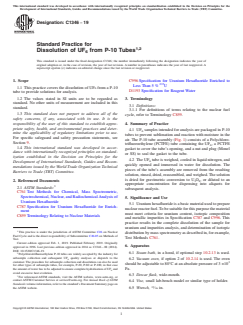 ASTM C1346-19 is a standard published by ASTM International. Its full title is "Standard Practice for Dissolution of UF<inf>6</inf> from P-10 Tubes". This standard covers: SIGNIFICANCE AND USE 5.1 Uranium hexafluoride is a basic material used to prepare nuclear reactor fuel. To be suitable for this purpose the material must meet criteria for uranium content, isotopic composition and metallic impurities in Specification C787 and C996. This practice results in the complete dissolution of the sample for uranium and impurities analysis, and determination of isotopic distribution by mass spectrometry as described in, for example, Test Methods C761. SCOPE 1.1 This practice covers the dissolution of UF6 from a P-10 tube to provide solutions for analysis. 1.2 The values stated in SI units are to be regarded as standard. No other units of measurement are included in this standard. 1.3 This standard does not purport to address all of the safety concerns, if any, associated with its use. It is the responsibility of the user of this standard to establish appropriate safety, health, and environmental practices and determine the applicability of regulatory limitations prior to use. For specific safeguard and safety precaution statements, see Section 9. 1.4 This international standard was developed in accordance with internationally recognized principles on standardization established in the Decision on Principles for the Development of International Standards, Guides and Recommendations issued by the World Trade Organization Technical Barriers to Trade (TBT) Committee.