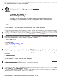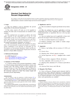 ASTM E1945-21 is a standard published by ASTM International. Its full title is "Standard Test Method for Percent Dispersibility". This standard covers: SIGNIFICANCE AND USE 4.1 This test method is designed specifically for dry formulations. 4.2 This test method may not be applicable to all dry formulations such as those containing water soluble or liquid technicals/pesticides or ingredients that rise to the top upon separation. 4.3 This test method may not be applicable to those technicals that decompose below the drying temperature. 4.4 This test method should be run in duplicate. 4.5 Products containing water soluble or volatile components may result in errors. SCOPE 1.1 This test method is used to determine the percent dispersibility of dry pesticide formulations. 1.2 The values stated in SI units are to be regarded as standard. No other units of measurement are included in this standard. 1.3 This standard does not purport to address all of the safety concerns, if any, associated with its use. It is the responsibility of the user of this standard to establish appropriate safety, health, and environmental practices and determine the applicability of regulatory limitations prior to use. For specific precautionary statements see Section 7. 1.4 This international standard was developed in accordance with internationally recognized principles on standardization established in the Decision on Principles for the Development of International Standards, Guides and Recommendations issued by the World Trade Organization Technical Barriers to Trade (TBT) Committee.