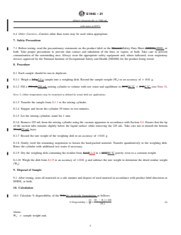 SIGNIFICANCE AND USE 4.1 This test method is designed specifically for dry formulations. 4.2 This test method may not be applicable to all dry formulations such as those containing water soluble or liquid technicals/pesticides or ingredients that rise to the top upon separation. 4.3 This test method may not be applicable to those technicals that decompose below the drying temperature. 4.4 This test method should be run in duplicate. 4.5 Products containing water soluble or volatile components may result in errors. SCOPE 1.1 This test method is used to determine the percent dispersibility of dry pesticide formulations. 1.2 The values stated in SI units are to be regarded as standard. No other units of measurement are included in this standard. 1.3 This standard does not purport to address all of the safety concerns, if any, associated with its use. It is the responsibility of the user of this standard to establish appropriate safety, health, and environmental practices and determine the applicability of regulatory limitations prior to use. For specific precautionary statements see Section 7. 1.4 This international standard was developed in accordance with internationally recognized principles on standardization established in the Decision on Principles for the Development of International Standards, Guides and Recommendations issued by the World Trade Organization Technical Barriers to Trade (TBT) Committee.