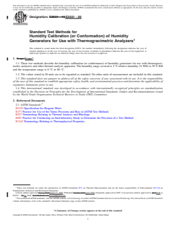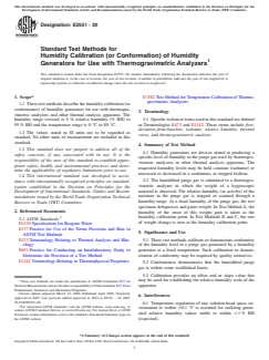 ASTM E2551-20 is a standard published by ASTM International. Its full title is "Standard Test Methods for Humidity Calibration (or Conformation) of Humidity Generators for Use with Thermogravimetric Analyzers". This standard covers: SIGNIFICANCE AND USE 5.1 These test methods calibrate or demonstrate conformity of the humidity level in a purge gas generated by a humidity generator at a fixed temperature. Such calibration or demonstration of conformity may be required by quality initiatives. 5.2 Conformance demonstrates that the humidified purge gas is within some established limits. 5.3 Calibration provides an offset and or slope value that may be used for establishing the relative humidity scale of the apparatus. SCOPE 1.1 These test methods describe the humidity calibration (or conformance) of humidity generators for use with thermogravimetric analyzers and other thermal analysis apparatus. The humidity range covered is 5 % relative humidity (% RH) to 95 % RH and the temperature range is 0 °C to 80 °C. 1.2 The values stated in SI units are to be regarded as standard. No other units of measurement are included in this standard. 1.3 This standard does not purport to address all of the safety concerns, if any, associated with its use. It is the responsibility of the user of this standard to establish appropriate safety, health, and environmental practices and determine the applicability of regulatory limitations prior to use. 1.4 This international standard was developed in accordance with internationally recognized principles on standardization established in the Decision on Principles for the Development of International Standards, Guides and Recommendations issued by the World Trade Organization Technical Barriers to Trade (TBT) Committee.