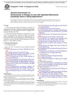 ASTM F1548-01(2023) is a technical specification published by ASTM International. Its full title is "Standard Specification for Performance of Fittings for Use with Gasketed Mechanical Couplings Used in Piping Applications". This standard covers: ABSTRACT This specification defines classification, materials, test requirements, inspection certification, marking and packaging of fittings for use with gasketed mechanical couplings used in piping applications. These fittings are classified into the following design types: Type I and Type II. The design of the fittings may be qualified by mathematical analysis in accordance with piping codes. SCOPE 1.1 This specification defines classification, materials, test requirements, inspection certification, marking and packaging of fittings for use with gasketed mechanical couplings complying to Specification F1476. 1.2 This international standard was developed in accordance with internationally recognized principles on standardization established in the Decision on Principles for the Development of International Standards, Guides and Recommendations issued by the World Trade Organization Technical Barriers to Trade (TBT) Committee.