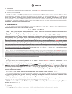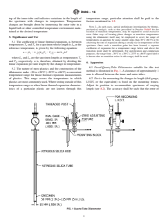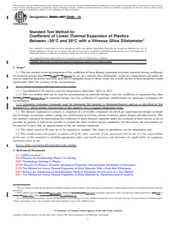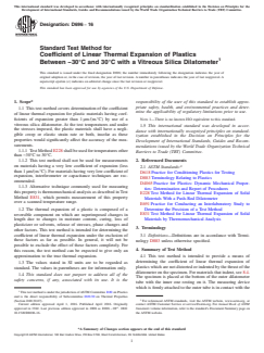 SIGNIFICANCE AND USE 5.1 The coefficient of linear thermal expansion, α, between temperatures T1 and T2 for a specimen whose length is L0 at the reference temperature, is given by the following equation: where L1 and L2 are the specimen lengths at temperatures T1 and T2, respectively. α is, therefore, obtained by dividing the linear expansion per unit length by the change in temperature. 5.2 The nature of most plastics and the construction of the dilatometer make −30 to +30°C (−22°F to +86°F) a convenient temperature range for linear thermal expansion measurements of plastics. This range covers the temperatures in which plastics are most commonly used. Where testing outside of this temperature range or when linear thermal expansion characteristics of a particular plastic are not known through this temperature range, particular attention shall be paid to the factors mentioned in 1.2. Note 2: In such cases, special preliminary investigations by thermo-mechanical analysis, such as that prescribed in Practice D4065 for the location of transition temperatures, may be required to avoid excessive error. Other ways of locating phase changes or transition temperatures using the dilatometer itself may be employed to cover the range of temperatures in question by using smaller steps than 30°C (86°F) or by observing the rate of expansion during a steady rise in temperature of the specimen. Once such a transition point has been located, a separate coefficient of expansion for a temperature range below and above the transition point shall be determined. For specification and comparison purposes, the range from −30°C to +30°C (−22°F to +86°F) (provided it is known that no transition exists in this range) shall be used. SCOPE 1.1 This test method covers determination of the coefficient of linear thermal expansion for plastic materials having coefficients of expansion greater than 1 µm/(m.°C) by use of a vitreous silica dilatometer. At the test temperatures and under the stresses imposed, the plastic materials shall have a negligible creep or elastic strain rate or both, insofar as these properties would significantly affect the accuracy of the measurements. 1.1.1 Test Method E228 shall be used for temperatures other than −30°C to 30°C. 1.1.2 This test method shall not be used for measurements on materials having a very low coefficient of expansion (less than 1 µm/(m.°C). For materials having very low coefficient of expansion, interferometer or capacitance techniques are recommended. 1.1.3 Alternative technique commonly used for measuring this property is thermomechanical analysis as described in Test Method E831, which permits measurement of this property over a scanned temperature range. 1.2 The thermal expansion of a plastic is composed of a reversible component on which are superimposed changes in length due to changes in moisture content, curing, loss of plasticizer or solvents, release of stresses, phase changes and other factors. This test method is intended for determining the coefficient of linear thermal expansion under the exclusion of these factors as far as possible. In general, it will not be possible to exclude the effect of these factors completely. For this reason, the test method can be expected to give only an approximation to the true thermal expansion. 1.3 The values stated in SI units are to be regarded as standard. The values in parentheses are for information only. 1.4 This standard does not purport to address all of the safety concerns, if any, associated with its use. It is the responsibility of the user of this standard to establish appropriate safety and health practices and determine the applicability of regulatory limitations prior to use. Note 1: There is no known ISO equivalent to this standard.
