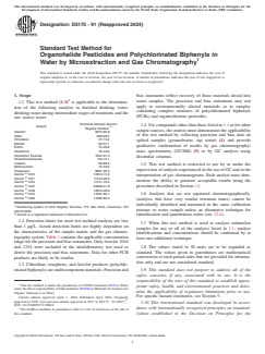 ASTM D5175-91(2024): Standard Test Method for Organohalide Pesticides and Polychlorinated Biphenyls in Water by Microextraction and Gas Chromatography establishes procedures for the determination of specific organochlorine pesticides and PCBs (polychlorinated biphenyls) in various water matrices, including finished drinking water, treated water in process, and raw source water. The method utilizes microextraction techniques followed by gas chromatography (GC) analysis, ensuring reliable detection and quantitation of persistent, environmentally significant contaminants at low concentrations.