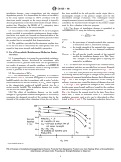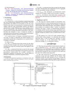 SIGNIFICANCE AND USE 4.1 The long-term material strength of geosynthetic reinforcement material is a critical design parameter for many civil engineering projects including, but not limited to, reinforced wall structures and reinforced slopes. Geosynthetic reinforcement products are produced using a variety of polymeric materials and using a variety of manufacturing procedures. Accordingly, product-specific testing using representative produced products is recommended for establishment of long-term material strength for products used as reinforcement in structures. 4.2 The primary use of the test results obtained from a reinforcement testing program is to determine the available long-term (that is, end of design life, typically 75 years) material strength, Tal, of the reinforcement. The available long-term strength, Tal, is calculated as follows: 4.3 This long-term geosynthetic reinforcement strength concept is illustrated in Fig. 1. As shown in the figure, some strength losses occur immediately upon installation, and others occur throughout the design life of the reinforcement. Much of the long-term strength loss does not begin to occur until near the end of the reinforcement design life. FIG. 1 Long-Term Geosynthetic Strength Concepts 4.4 The value selected for Tult, for design purposes, is the minimum average roll value (MARV) for the product. This minimum average roll value, denoted as TMARV, accounts for statistical variance in the material strength. Other sources of uncertainty and variability in the long-term strength result from installation damage, creep extrapolation, and the chemical degradation process. It is assumed that the observed variability in the creep rupture envelope is 100 % correlated with the short-term tensile strength, as the creep strength is typically directly proportional to the short-term tensile strength within a product line. Therefore, the MARV of Tult adequately takes into account variability in the creep strength. 4.5 In accordanc... SCOPE 1.1 This guide presents a description of how to use test results from reduction factor test reports for reinforcement geosynthetics. It is based solely on testing and reporting requirements as established in American Association of State Highway and Transportation Officials (AASHTO) standard AASHTO R 69-15, Standard Practice for Determination of Long-Term Strength for Geosynthetic Reinforcement. AASHTO R 69-15 is used to determine the long-term allowable material strength, Tal, that is solely product property performance dependant. 1.2 This guide is intended to assist designers and users of reinforcement geosynthetics when reviewing reports of reduction factor testing efforts. This guide is not intended to replace education or experience, or other alternative design procedures. This guide is not intended to represent or replace the standard of care by which the adequacy of a given professional service must be judged, nor should this document be applied without consideration of a project’s many unique aspects. Not all aspects of this guide may be applicable in all circumstances. The word “standard” in the title of this document means only that the document has been approved through the ASTM consensus process. 1.3 The values stated in either SI units or inch-pound units are to be regarded separately as standard. The values stated in each system may not be exact equivalents; therefore, each system shall be used independently of the other. Combining values from the two systems may result in nonconformance with the standard. 1.4 This standard does not purport to address all of the safety concerns, if any, associated with its use. It is the responsibility of the user of this standard to establish appropriate safety, health, and environmental practices and determine the applicability of regulatory limitations prior to use. 1.5 This international standard was developed in accordance with internationally recognized pr...