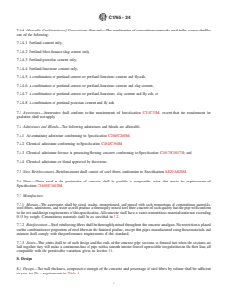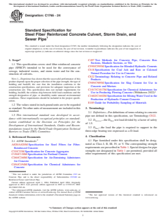 ASTM C1765-24 is a technical specification published by ASTM International. Its full title is "Standard Specification for Steel Fiber Reinforced Concrete Culvert, Storm Drain, and Sewer Pipe". This standard covers: ABSTRACT This specification establishes the requirements for steel fiber reinforced concrete pipe (SFRCP) of internal diameters 12-48 in., to be used in the conveyance of sewage, industrial wastes, and storm water as well as the construction of culverts. Pipe furnished under this specification shall be designated as Class I, II, III, IV, or V. The standard covers the basis of acceptance of the pipe design, design and manufacturing, materials and manufacture, proof of design testing, physical requirements, compression tests for determining th compressive strength of steel fiber concrete, dimensions and permissible variations, repairs, inspection and rejection, disposition of a rejected lot, certification, and product marking. Definitions of terms relating to concrete pipe are provided, including D-load, the load the pipe is required to support in the three-edge bearing test. SCOPE 1.1 This specification covers steel fiber reinforced concrete pipe (SFRCP) intended to be used for the conveyance of sewage, industrial wastes, and storm water and for the construction of culverts. Note 1: Experience has shown that the successful performance of this product depends upon the proper selection of the pipe strength, the type of bedding and backfill, the care that the installation conforms to the construction specifications, and provision for adequate inspection at the construction site. This specification does not include requirements for bedding, backfill, the relation ship between field load conditions and the strength designation of pipe, or durability under unusual environmental conditions. These requirements should be included in the project specification. 1.2 The values stated in inch-pound units are to be regarded as standard. No other units of measurement are included in this standard. 1.3 This international standard was developed in accordance with internationally recognized principles on standardization established in the Decision on Principles for the Development of International Standards, Guides and Recommendations issued by the World Trade Organization Technical Barriers to Trade (TBT) Committee.