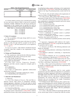 ABSTRACT This specification establishes the requirements for steel fiber reinforced concrete pipe (SFRCP) of internal diameters 12-48 in., to be used in the conveyance of sewage, industrial wastes, and storm water as well as the construction of culverts. Pipe furnished under this specification shall be designated as Class I, II, III, IV, or V. The standard covers the basis of acceptance of the pipe design, design and manufacturing, materials and manufacture, proof of design testing, physical requirements, compression tests for determining th compressive strength of steel fiber concrete, dimensions and permissible variations, repairs, inspection and rejection, disposition of a rejected lot, certification, and product marking. Definitions of terms relating to concrete pipe are provided, including D-load, the load the pipe is required to support in the three-edge bearing test. SCOPE 1.1 This specification covers steel fiber reinforced concrete pipe (SFRCP) intended to be used for the conveyance of sewage, industrial wastes, and storm water and for the construction of culverts. Note 1: Experience has shown that the successful performance of this product depends upon the proper selection of the pipe strength, the type of bedding and backfill, the care that the installation conforms to the construction specifications, and provision for adequate inspection at the construction site. This specification does not include requirements for bedding, backfill, the relation ship between field load conditions and the strength designation of pipe, or durability under unusual environmental conditions. These requirements should be included in the project specification. 1.2 The values stated in inch-pound units are to be regarded as standard. No other units of measurement are included in this standard. 1.3 This international standard was developed in accordance with internationally recognized principles on standardization established in the Decision on Principles for the Development of International Standards, Guides and Recommendations issued by the World Trade Organization Technical Barriers to Trade (TBT) Committee.