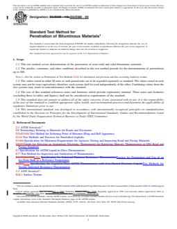 SIGNIFICANCE AND USE 5.1 The penetration test is used as a measure of consistency. Higher values of penetration indicate softer consistency. Note 2: The quality of the results produced by this standard are dependent on the competence of the personnel performing the procedure and the capability, calibration, and maintenance of the equipment used. Agencies that meet the criteria of Specification D3666 are generally considered capable of competent and objective testing, sampling, inspection, etc. Users of this standard are cautioned that compliance with Specification D3666 alone does not completely ensure reliable results. Reliable results depend on many factors; following the suggestions of Specification D3666 or some similar acceptable guideline provides a means of evaluating and controlling some of those factors. SCOPE 1.1 This test method covers determination of the penetration of semi-solid and solid bituminous materials. 1.2 The needles, containers, and other conditions described in this test method provide for the determinations of penetrations up to 500. Note 1: See the section on Penetration of Test Methods D244 for information and precision and bias on testing emulsion residue. 1.3 The values stated in either SI units or inch-pound units are to be regarded separately as standard. The values stated in each system may not be exact equivalents; therefore, each system shall be used independently of the other. Combining values from the two systems may result in nonconformance with the standard. 1.4 The text of this standard references notes and footnotes which provide explanatory material. These notes and footnotes (excluding those in tables and figures) shall not be considered as requirements of the standard. 1.5 This standard does not purport to address all of the safety concerns, if any, associated with its use. It is the responsibility of the user of this standard to establish appropriate safety, health, and environmental practices and determine the applicability of regulatory limitations prior to use. 1.6 This international standard was developed in accordance with internationally recognized principles on standardization established in the Decision on Principles for the Development of International Standards, Guides and Recommendations issued by the World Trade Organization Technical Barriers to Trade (TBT) Committee.